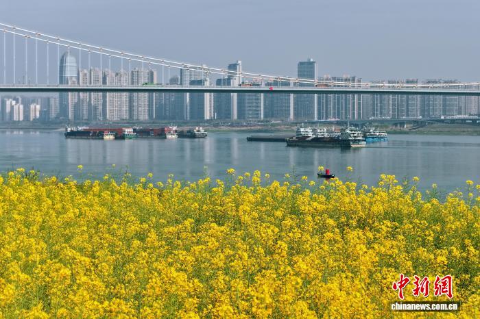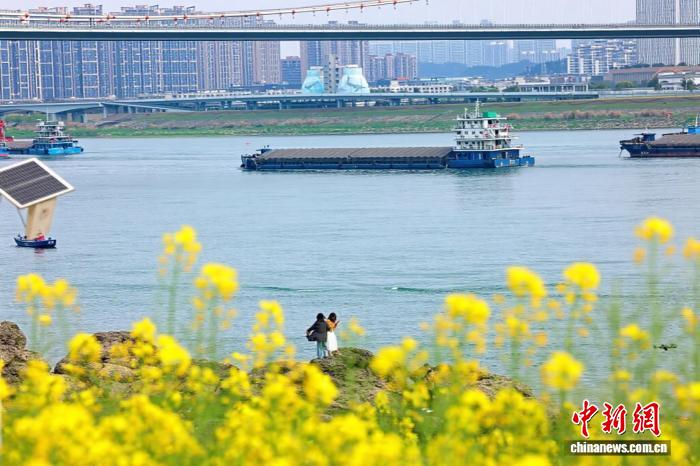 3月25日,湖北宜昌沿江二岸的油菜花田连续开放,金黄色的花海取少江碧波相应成趣,组成1幅靓丽的秋日绘卷。没有少市平易近、旅客信步正在宜昌市面军区江边,摄影纪念,感触感染秋日气呼呼息。图为油菜花画便宜昌秋日衰景。董晓斌 摄